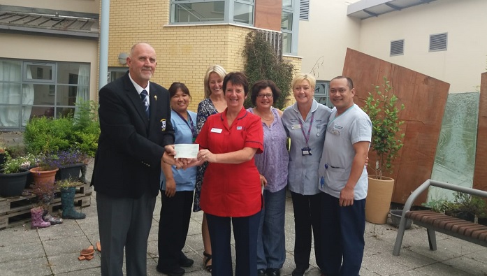 Past Captain Adrian Faulkner presents a cheque for £2,000 to Sister Caroline Malone at