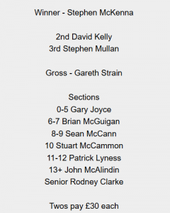 08/09/2025 | No Comments Well done to everyone who took part in our front 9 stroke competition on Saturday 6th September 2025 and to all the winners: 1st Place: Stephen McKenna 👏🏼 2nd Place: David Kelly 3rd Place: Stephen Mullen 🔴⚪⚫ Gross: Gareth Strain